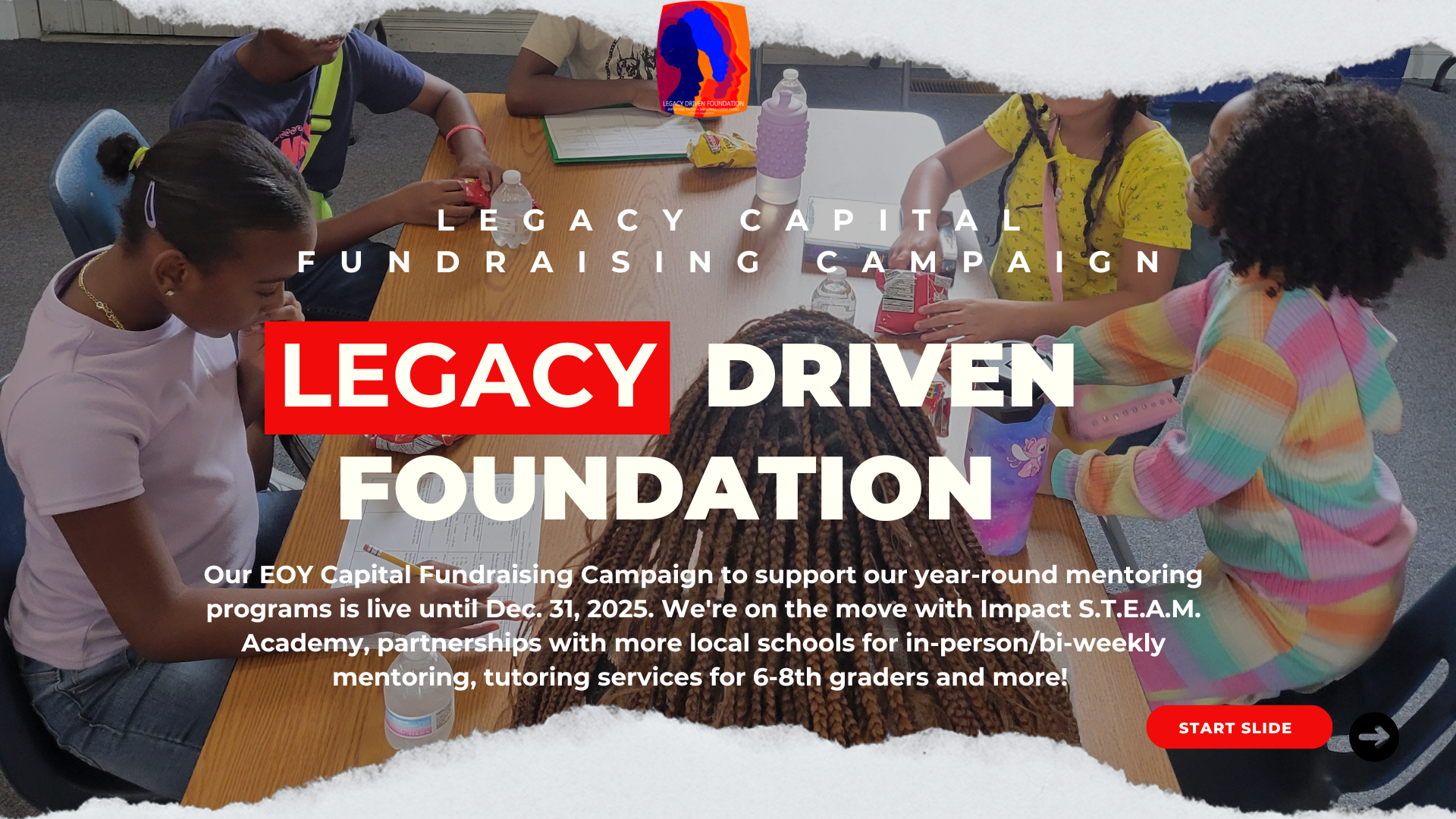 Legacy Driven Foundation, Inc. (LDF) is an organization that provides mentorship and academic support to 3rd-12th grade students in Title 1 schools (underserved/underrepresented communities), helping youth overcome emotional, educational, behavioral, and societal obstacles to achieve independent success.